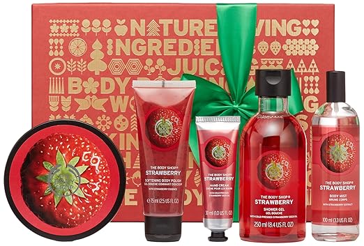 The gift set includes a shower gel, body polish, body butter, body mist, and a hand cream - all with the scent of heavenly strawberries.